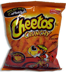 Crujientes stostaditos con forma de palillo elaborado con cereal de maiz horneado con sabor a queso y mas que eso,con bañados con salsa.Este churro es de la marca Frito Lay y su nombre comercial es Cheetos la calidad es muy buena. La etiqueta de este churro contiene aspectos nutricionales,composicion quimica,fecha de vencimiento y lugares de distribuccion.